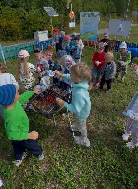 Дети сортируют мусор (пластиковые стаканы, батарейки и бумага)