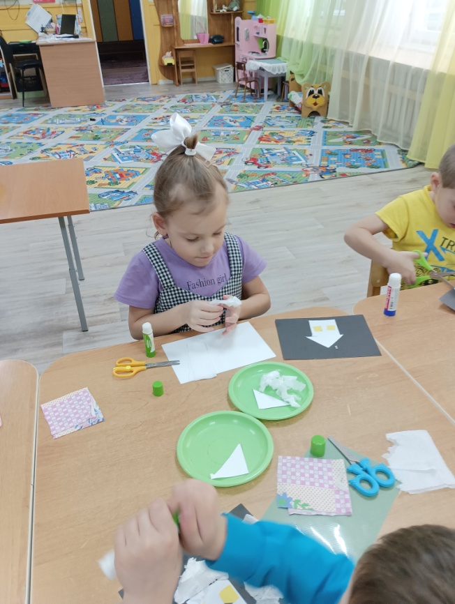 На столе перед детьми лежит тонированная бумага для аппликации