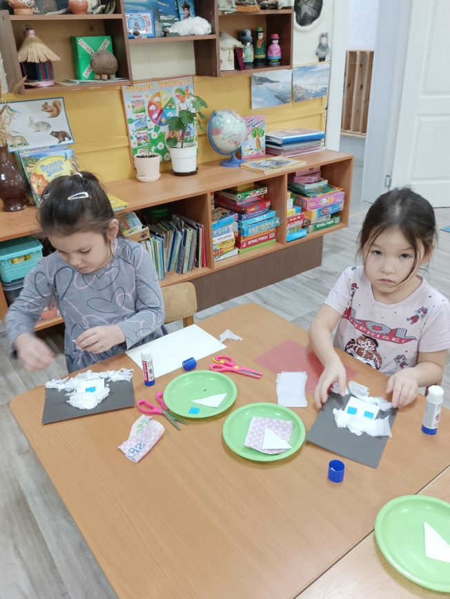 Задачи.Учить детей раскрывать особенности образа, творчески применяя разныетехники аппликации (сгибание, обрывная, накладная); закрепить умение делить предмет на 2 равные части по диагонали, по линии сгиба; учить использовать в работе разные приемы обрывной аппликации; формировать чувство формы и композиции, умение замечать красоту зимней природы