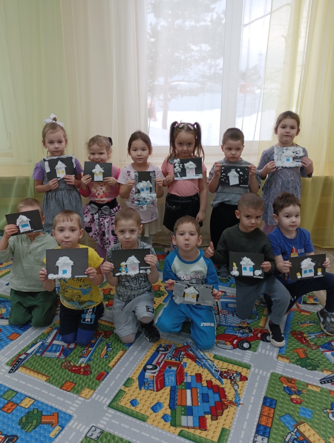 Молодцы, ребята, вы все справились. Посмотрите, пожалуйста, на композиции ваших друзей, у каждого получился свой сказочный заснеженный домик. На чей домик сильнее всего нападал снег?