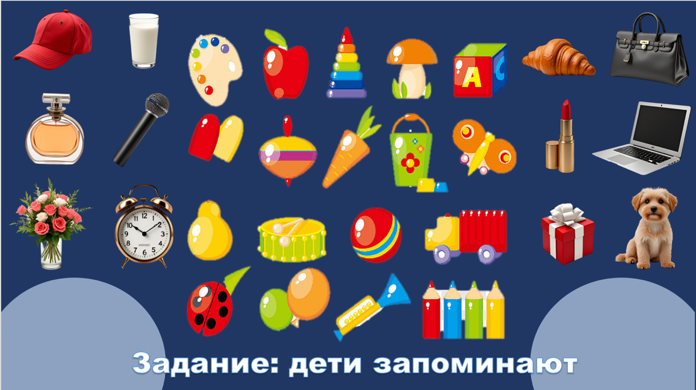 Ведущий: Первый наш эксперимент посвящен изучению памяти. Известно, что способность к запоминанию – ключевой компонент интеллекта! Сейчас на экране появится коллаж из различных предметов. У вас есть ровно 1 минута, чтобы запомнить как можно больше из них. Ваша задача – ассистенты (дети) запоминают, а главные ученые (мамы) – фиксируют результаты на наших бланках! Внимание на экран!