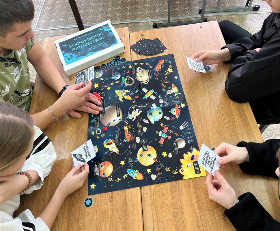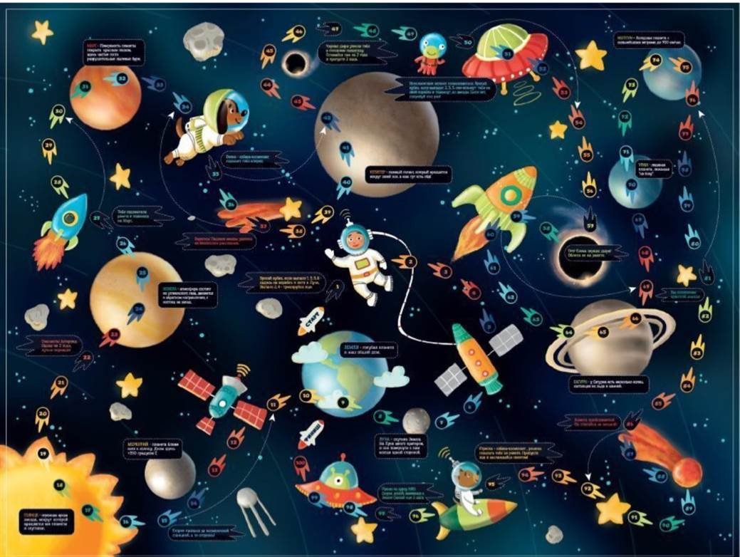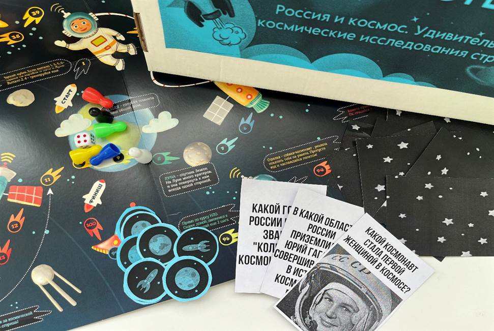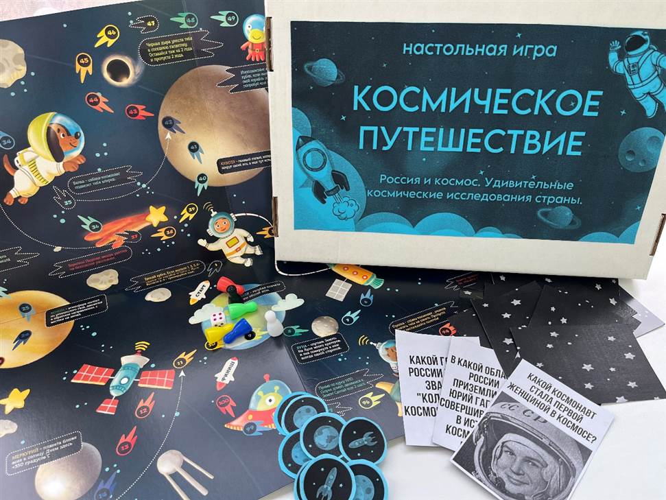 2) Этап игры: игра состоит из множества раундов, в каждом из которых команды поочередно выбирают карточку с заданием. Задания могут включать: - ответы на вопросы (например, «Кто был первым человеком в космосе?», соответствующие картинки (например, «Угадай планету по картинке»).