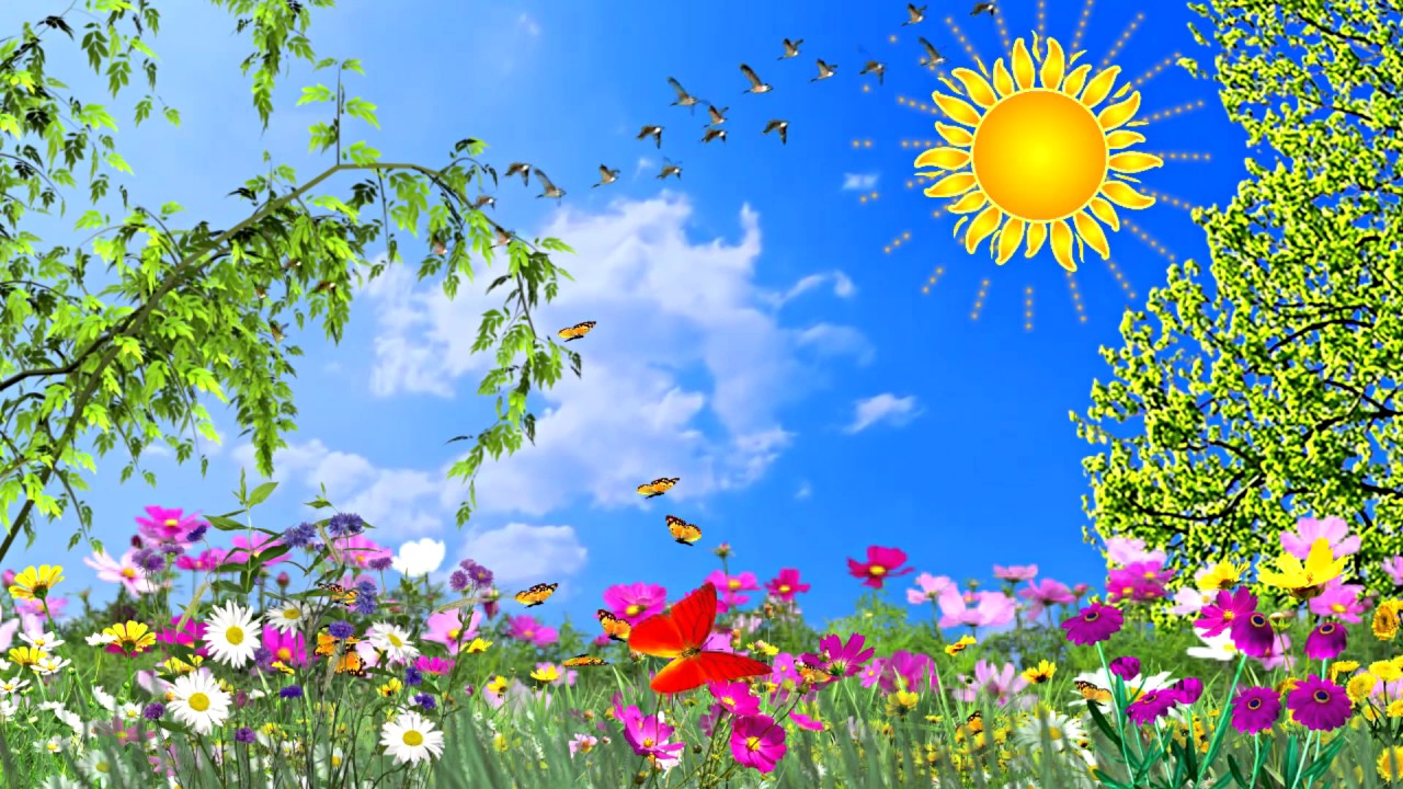- Графические объекты: солнце, облака, птицы, насекомые.