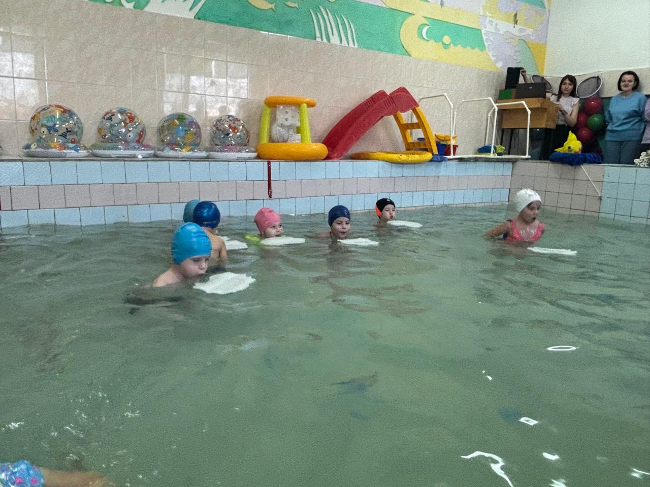 Дети заходят в бассейн под музыку