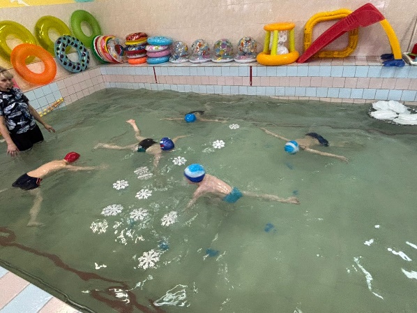 Инструктор: Молодцы, Ребята! Посмотрите, пошел снег! (Инструктор раскидывает плавающиеснежинки по всему бассейну).
