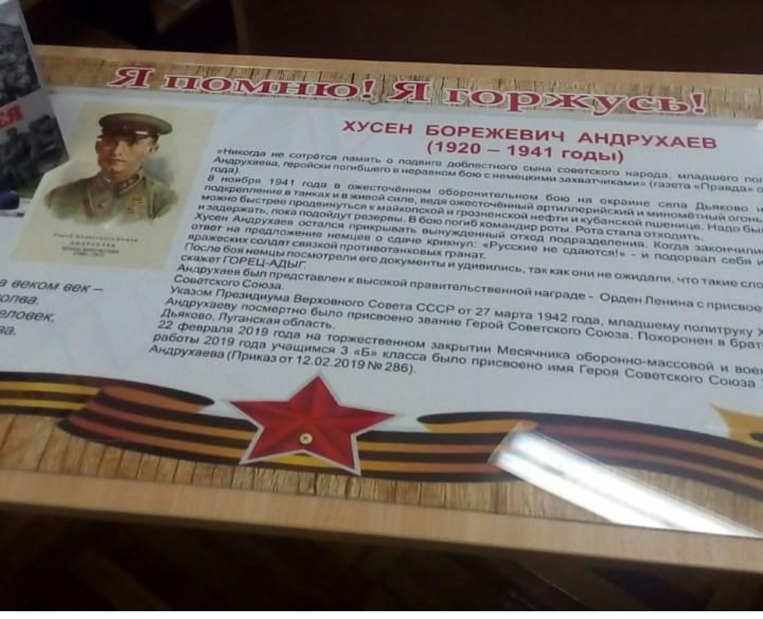 - Никогда не сотрется память о подвиге доблестного сына адыгейского народа, младшего политрука Хусена Андрухаева, геройски погибшего в неравном бою с немецко-фашистскими захватчиками.