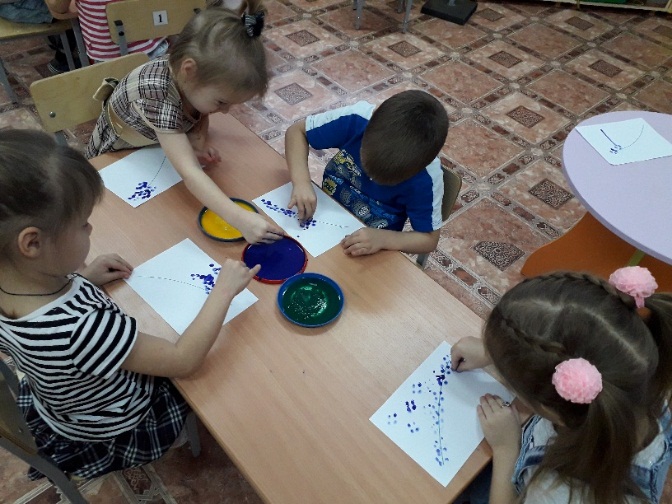 - Вот и я предлагаю вам нарисовать сирень, но рисовать мы будем ее не кисточками, а пальчиками. Нужно взять пальчики в виде цветочка, мокнуть ими в краску фиолетового цвета и оставить отпечаток на бумаге, жёлтой краской пальчиком сделать серединку, зелёной листочки.