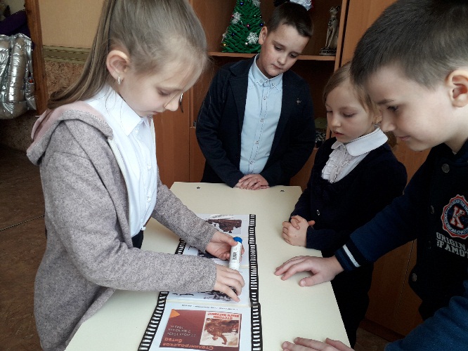 ( Класс делится на две группы. В разных концах класса стоят «рабочие киностудии». На столах кадры кинопленки, фотографии, подписи к слайдам. Из данного материала нужно составить фильм и рассказать о нем)
