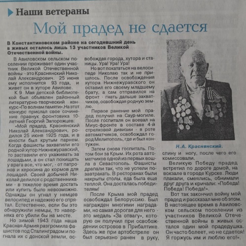 ернувшись в хутор Авилов, Николай Александрович связал свою жизнь с сельским хозяйством, семьёй. Он работал бригадиром бригады № 2 колхоза «Мир», растил детей, внуков и правнуков. На фото мой прадедушка Николай Александрович с прабабушкой, его супругой Валентиной Константиновной. Николай Александрович был очень отзывчивым, жизнерадостным человеком. Всегда откликался на приглашения посетить в школе торжественные мероприятия, линейки, уроки памяти и мужества, классные часы, где общался с подрастающим поколением, делился воспоминаниями, отвечал на вопросы. Приходили в гости и к нему.