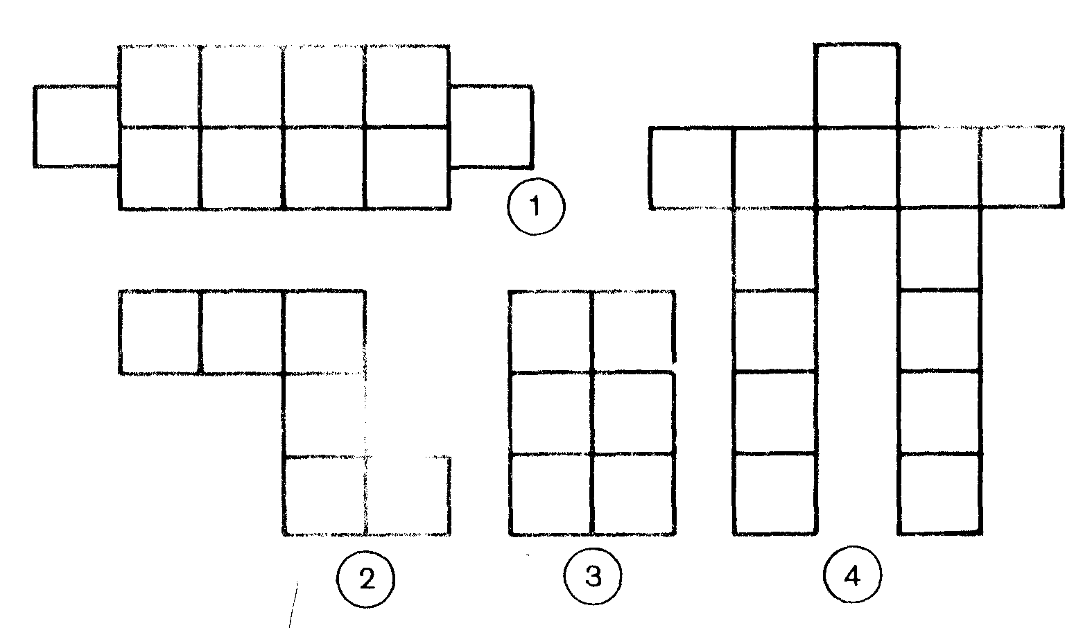 2.Начертите две равные фигуры и одну, неравную им, так, чтобы каждая из этих фигур состояла из 4 клеток тетради. 3. Длина прямоугольника 32 см, а ширина в 4 раза меньше. Найдите площадь и периметр прямоугольника. 4.Периметр квадрата 48 см. Найдите площадь квадрата. 5. Площадь прямоугольника 221 см2. Длина одной из его сторон равна 17 см. Найдите периметр этого прямоугольника. | Вариант 2. 1. Площадь одного квадратика равна 1 см2 Какова площадь каждой фигуры, изображенной на рисунке?