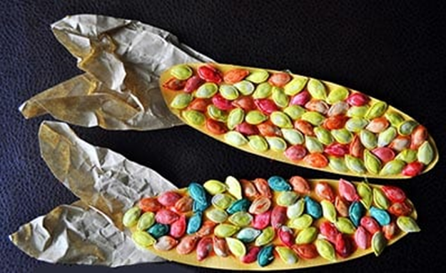 | Окрашивать семечки можно несколькими способами. Первый способ – наносить краску на каждую семечку в отдельности. Этот вариант подойдет в том случае, если для работы требуется небольшое количество семян. Если же планируется изготовление объемной поделки из тыквенных семечек, своими руками, при помощи кисточки, окрашивать их будет утомительно и долго. Поэтому нужно просто погрузить партию семечек в полиэтиленовый мешочек. | ||