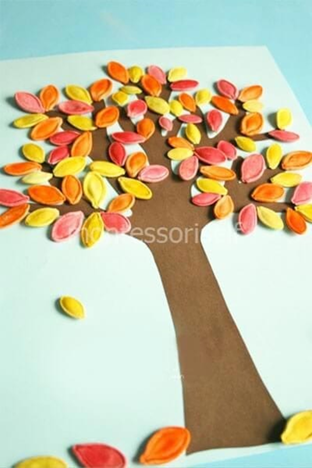 Осеннее дерево с падающими листьями. | Показ, объяснение, помощь. | Осеннее дерево из тыквенных семечек Сам ствол дерева тоже можно выложить из семечек. При создании дерева с опадающими листьями можно использовать необычную методику: нанести клей на заготовку для аппликации, а затем посыпать картину окрашенными семечками. | Картина «Осеннее дерево». |