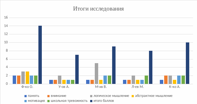 Память | Внимание | Логическоемышление | Абстрактноемышление | Мотивация | Школьнаятревожность | Итого | |