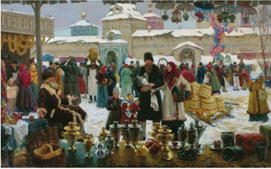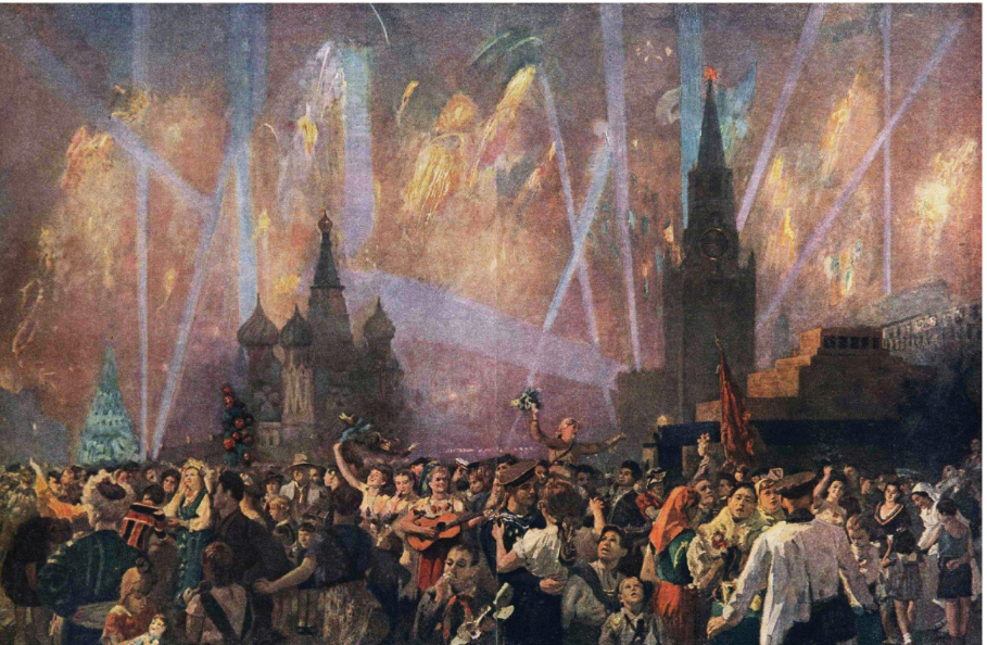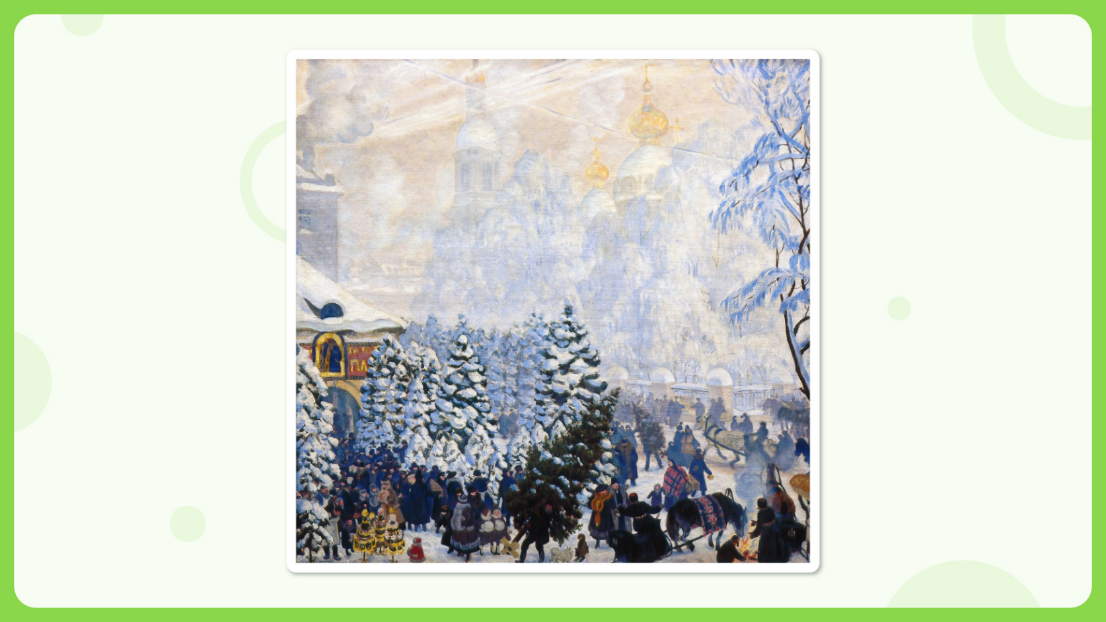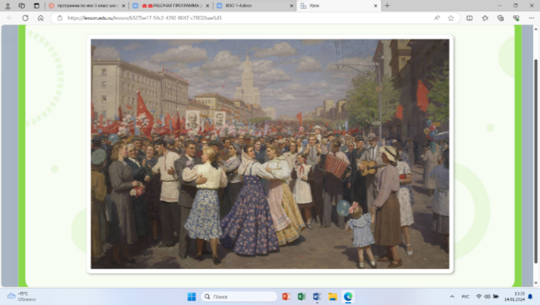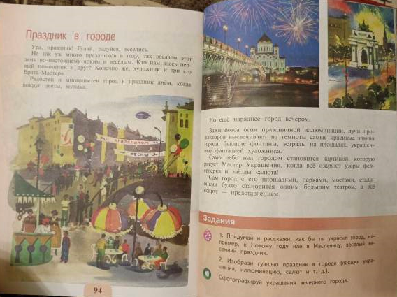 Отвечают на вопрос про масленицу фронтально. Подводят общий итог: (*если сложно, учитель предлагает подвести итог, прочитав текст) Масленица — это один из самых популярных праздников, который возник во времена язычества, но сохранился до сих пор. В течение недели перед Великим постом люди пекут блины, посещают ярмарки, устраивают массовые гуляния, а в последний день сжигают чучело, чтобы проститься с зимой и встретить весну. Каждый день масленичной недели назван по-своему. На картине день Победы. Позади годы страшной войны. Москва встречает победителей салютом. Это живопись. (Работают со словарем) - Живопись — наиболее популярный и прославленный в европейской культуре вид изобразительного искусства, произведения которого создаются с помощью красок. Похожи сюжет и образы картин 2, 3, 4. (Работают со словарем) Сюжет — это последовательность и связь описания событий в литературном или сценическом произведении; в произведении изобразительного искусства — предмет изображения. Дают положительный ответ. Образ— порядок, организация. Образ жизни — групповая деятельность людей, характеризующие особенности их общения, поведения. Определяюттему урока «Праздник в городе» Предлагают гипотезы, чему можно научиться на уроке с такой темой. | |||||||||||||