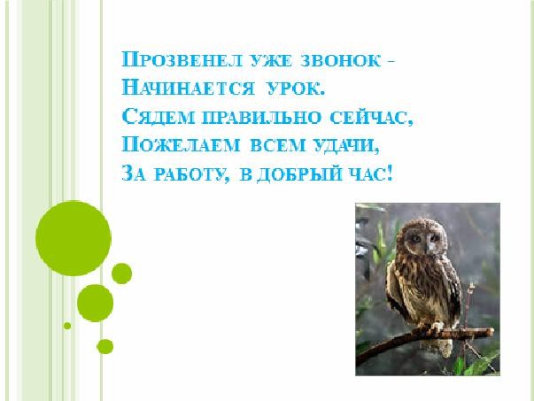 Прозвенелужезвонок- Начинается урок. Сядемправильносейчас, Пожелаем всем удачи,За работу, в добрый час! 1.Сегодняунаснаурокехочет побывать Мудрая Сова. Она будетрадапосмотреть,каквы занимаетесь, чему уже научились?