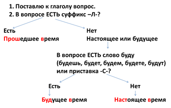 -Какие окончания имеют глаголы 2-го л. ед.ч.? -Как ещё можно определить лицо и число глагола? -На какие вопросы отвечают глаголы 2-го л.ед.ч.? 2. Определить время глагола. В случае затруднения можно использовать алгоритм. Увидишь, видят, молчишь, замолчал, пускает, будет слушать, встает.