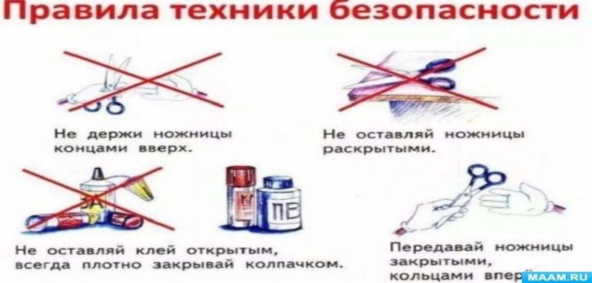 Педагог: давайте с вами повторим технику безопасности при работе с ножницами и клеем. (Ребята рассказывают правила).