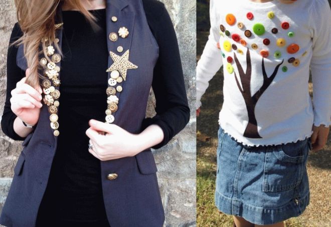 В качестве украшения пуговицы используются не только в одежде, но из них выполняют аппликацию, брошки, бижутерию, для украшения и декора мебели, изготовления сувениров.