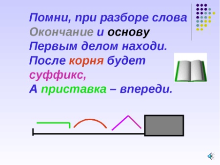 Проработка темы. | 5 мин. | АМО «По порядку становись» | Заимствованный | Этап урока: метод проработки учебного материала Время проведения: 5 мин. Название метода:«По порядку становись» Происхождение метода: Заимствованный Цель: Закрепление знаний о составе слова Необходимые материалы: карточки с изображением частей слова, слоги для составления слов, сигнальные карточки. Предварительная подготовка: Технология проведения: Группам предлагаются карточки со схематическим изображением частей слова. Учащиеся должны составить их по порядку и составить алгоритм действия. По этому алгоритму составить слово из слогов и разобрать его по составу. | Ребята, сейчас вам предстоит работать в 4х. На столах лежат карточки с частями слова и слоги. Вам необходимо выработать алгоритм действия при разборе слова по составу. Затем из слогов составить слова и разобрать их по составу. Ребята, которые быстрее справятся с работой поднимают сигнальную карточку красного цвета. Я подхожу и проверяю работу, если все правильно они идут и помогают другим, у кого возникли трудности. Проверка на экране высвечиваются слова с разбором, ученики комментируют разбор и объясняют алгоритм действия. Слова на экране: под-вод-ник, на-клей-ка, при-го-род-ный. На последнем слайде подводим итог.