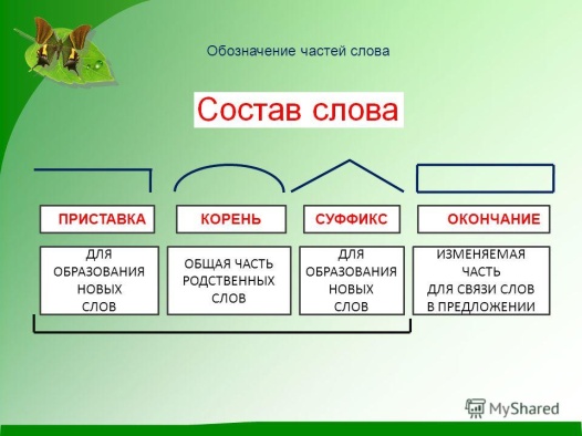 Учебный материал, подлежащий усвоению, актуализации, закреплению | Приставка. Суффикс. Корень. Окончание. Основа. | |