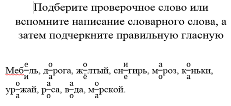Актуализация знаний | Актуализировать субъектный опыт для закрепления знаний и выявления затруднений в индивидуальной деятельности каждого учащегося. | Посмотрите на изображение, даны слова: мебель, дорога, желтый, снегирь, мороз, коньки, урожай, роса, вода, морской. Безударные гласные буквы написаны дробью, вы должны подобрать проверочное слово или вспомнить написание словарного слова, а затем подчеркнуть правильную гласную.