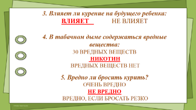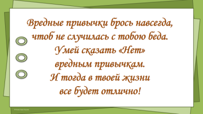 - А я для вас приготовила памятку в виде буклета о негативном влиянии вредных привычек. Она будет находится в нашем уголке и вы сможете подробнее узнать о причинах появления вредных привычек, о последствиях употребления алкогольных и наркотических средств, а также о том как можно избавиться от них.