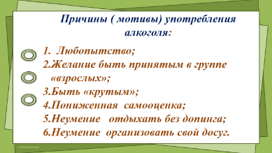 - Давайте обратим внимание на причины, которые с подвигают подростков к употреблению алкоголя.