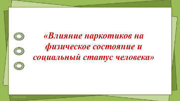 1.Ученик: Наркотик – греческое слово, означает остолбенение, потеря чувствительности, реакции на окружающее.Применение наркотиков полностью меняет организм человека.