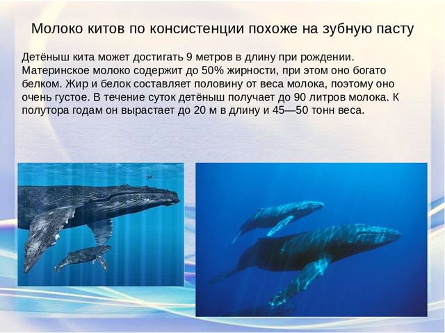 (Слайд 22) - Китообразные, как и другие млекопитающие, рождают детёнышей и выкармливают их молоком.
