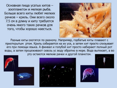(Слайд 31) – Каковы особенности питания синего кита? Синий кит очень медленно плавает в толще океанические воды. Если животное проголодалось, оно открывает пасть, и в нее попадают миллионы рачков. После этого кит закрывает пасть и с помощью языка выталкивает воду сквозь ус (фильтрует). Пища при этом остается на бахроме уса, и животное ее слизывает языком.