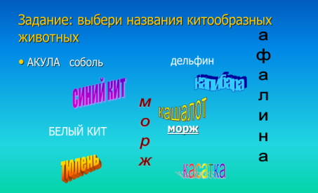 (Слад 4, 5, 6) - К китообразным относятся синий кит, кашалот, косатка, дельфин.