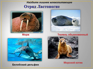 - По каким внешним признакам вы определили ластоногих животных? (Удлиненное и обтекаемое тело с короткой шеей, передние и задние конечности – ласты).