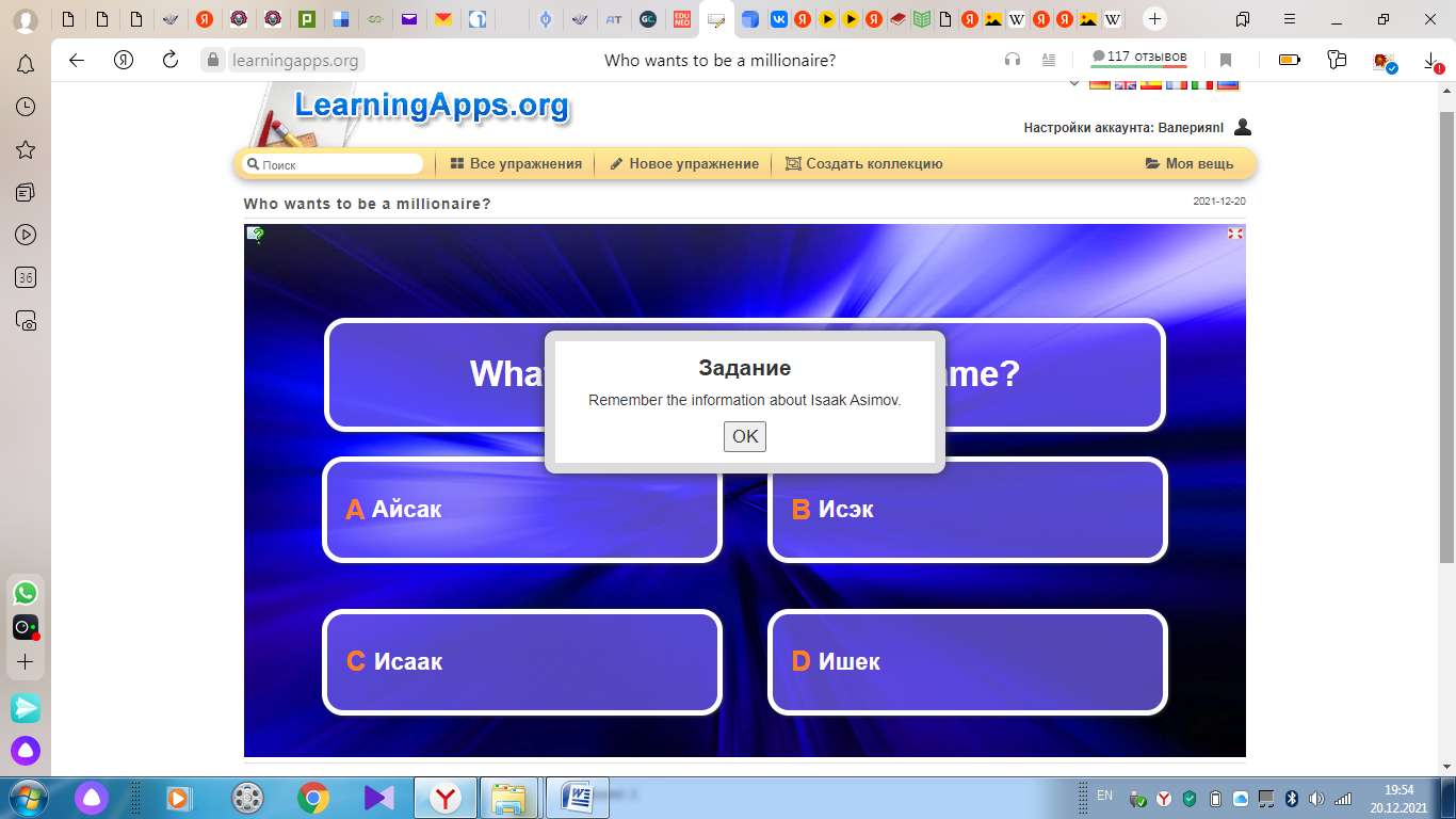 Задание связано с биографией биохимика Айзека Азимова в формате игры «Кто хочет стать миллионером?».