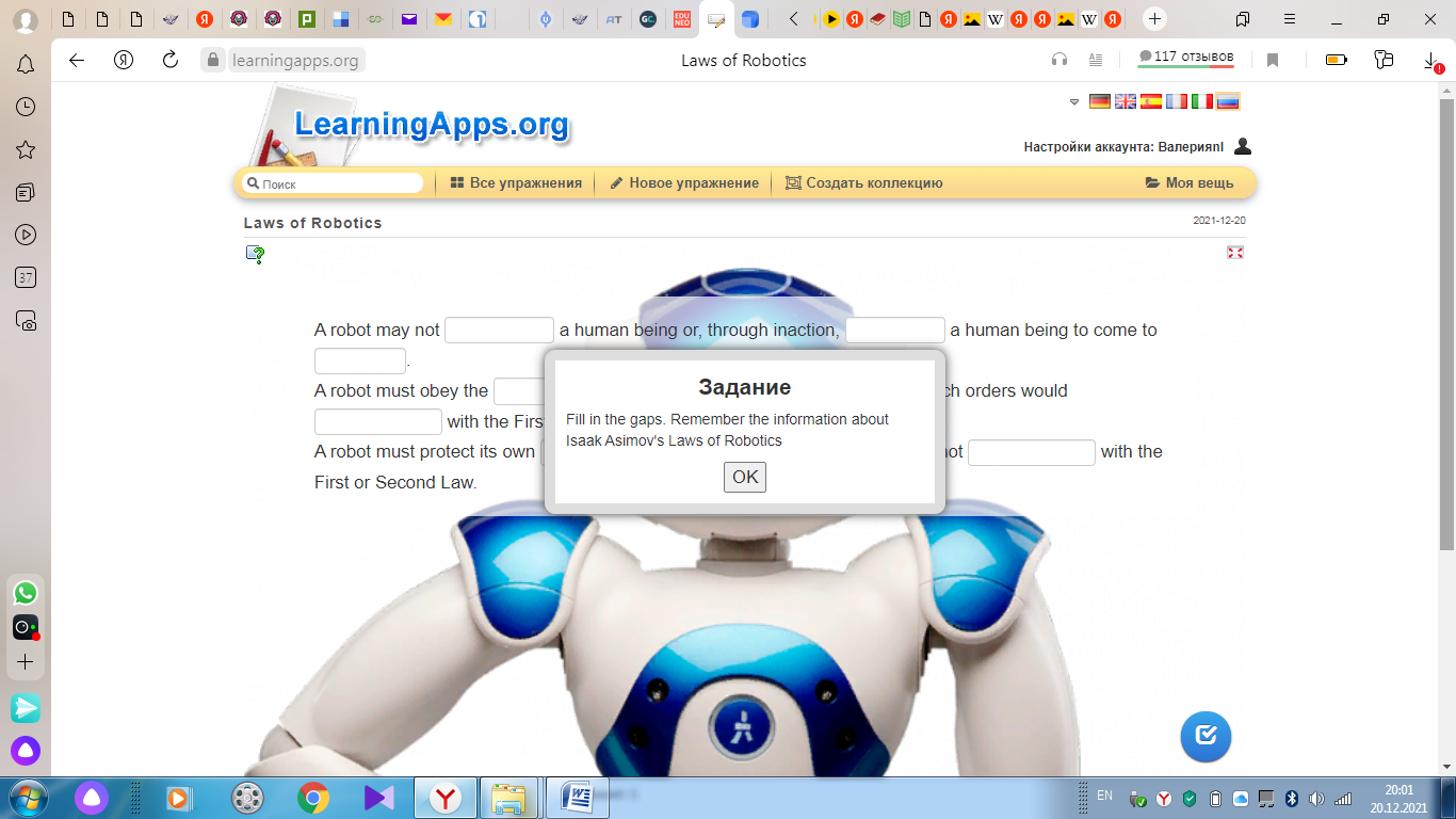 Упражнение № 2.Laws of Robotics. Fill in the gaps (ЗаконыРобототехники.Заполните пропуски) https://learningapps.org/display?v=p0k7jvvha21 .
