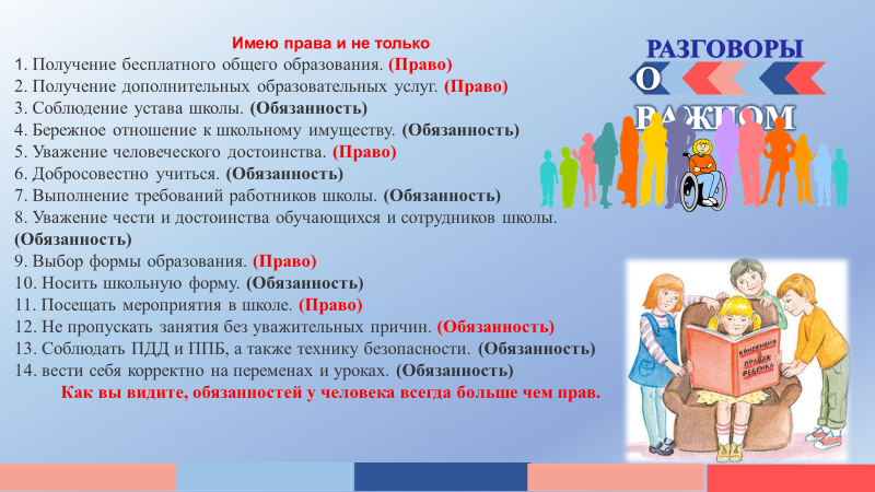 Прежде чем говорить: «Я хочу, я имею право» - нужно подумать о правах других. Независимо от желаний каждый человек должен выполнять свои обязанности. Права и обязанности неразделимы. Если люди будут правильно использовать права и выполнять свои обязанности, то жизнь в стране будет протекать организованно и спокойно. Тот, кто привык ни в чем и никогда не отказывать себе и не привык выполнять свои обязанности, чаще всего встает на путь нарушения закона. Проходя по жизни, как по тротуару, такой человек расталкивает окружающих его людей, забывая, что все люди имеют равные права и обязанности, что нет прав без обязанностей Надо уже сейчас, ребята, приучать себя к выполнению обязанностей и делать не только то, что «хочу- не хочу», но и то, что «могу» и «надо и всегда помнить , что вы живете среди людей, которые имеют точно такие же права, как и вы.