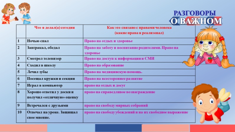 Что я делал(а) сегодня | Как это связано с правами человека (какие права я реализовал) | |