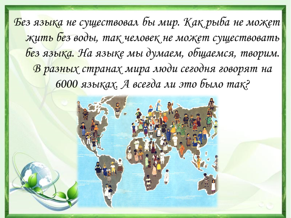 Землю населяют разные живые существа: от мельчайших бактерий до таких великанов, как слоны и киты. Но только человек обладает даром слова. И как бы мы не определяли этот дар – священный, божественный, величественный, великолепный, бесценный, бессмертный, чудесный – мы не отразим во всей полноте его огромного значения. Сложно себе представить, как общались люди, когда средством коммуникации был не язык, а, к примеру, жесты или мимика. Наверняка, без языка сегодня мы бы не сумели передать настолько образно и ярко все наши эмоции, переживания и мысли, воплощая их в песни, стихи или прозу.