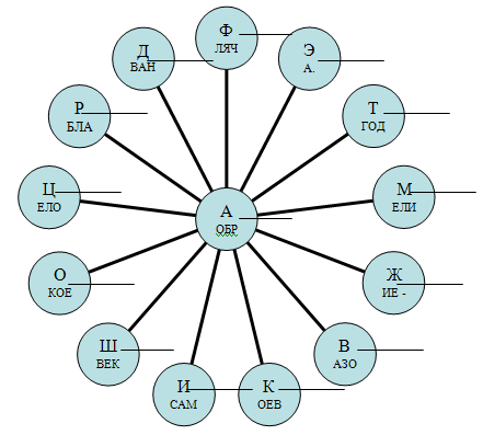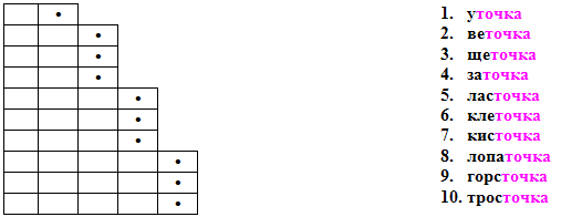 1) В этой загадочной лесенке заполните горизонтальные строчки именами существительными первого склонения так, чтобы каждое слово состояло не менее чем из шести букв, при чем последние пять букв должны быть одинаковыми во всех словах.
