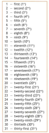 Ноmetask: 1) Запишите в тетрадь для домашних работ порядковые числительные словами в правильном порядке( не забывай ставить артикль the перед числительными). Для облегчения задачи используй таблицу числительных из учебника или воспользуйся подсказкой в конце рабочего листа