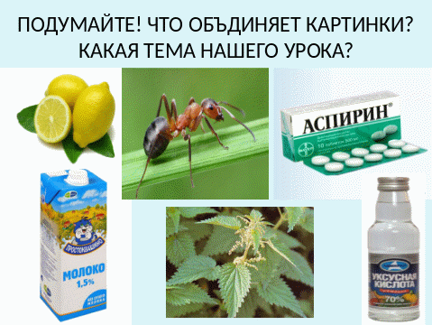 Уксуснаякислота Муравьинаякислота Лимоннаякислота Молочнаякислота Ацетилсалициловаякислота ФОРМУЛИРУЮТ ТЕМУ УРОКА «Кислоты». Определяют цель: сформулировать понятие, изучить свойства, номенклатуру классификацию кислот, их роль в жизни человека. Записывают тему урока в рабочих тетрадях | Коммуникативные Формируем умение оформлять свои мысли в письменной и устной форме умение взаимодействовать друг с другом, оценивать работу других Познавательная Формируем умение внимательно читать и понимать задание, выделять главные понятия, применять полученные знания, самостоятельно выделять и формулировать познавательную цель. Регулятивные Формируем умение определять цель деятельности и планировать свою работу Личностные Формируем учебно-познавательный интерес к новому учебному материалу |