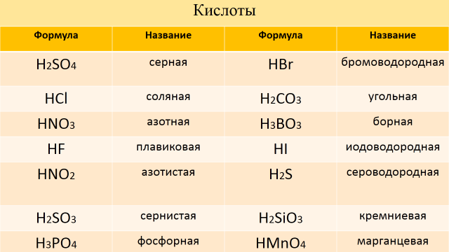3 | Формирование новых знаний Цель: развитие умения решать проблемные вопросы и расширять круг новых знаний Задачи: определить новое понятие – кислоты как класс веществ; разобраться с названиями и классификацией веществ, научиться распознавать кислоты среди других веществ, правильно использовать кислоты | Глядя на формулы наиболее известных неорганических кислот, найдите общий признак