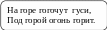 Учитель: Продолжаем дальше. Дети: (продолжают сказку) Работа над скороговоркой Учитель: Речка ответила: «Произнеси быстро скороговорку, и я вас спрячу» Читаем скороговорку вместе. Увеличиваем темп чтения. Произнесите эту скороговорку друг другу. Кто попробует произнести быстро скороговорку. У Дети: (продолжают сказку). -Вышли на полянку к яблоне, устали, захотели есть. Надо отдохнуть. Какую минутку проведём? Мы шли, шли, шли, Земляничку нашли. Сели, поели и дальше пошли. Работа со словами омонимами Учитель: Яблонька ответила: «Назови слова, которые звучат одинаково, но имеют разное значение». Дети: Коса, ключ, ручка, замок, лук… Учитель: Хорошо! Помогли. Продолжаем сказку. Дети: (продолжают сказку) Учитель: А печка сказала: «Догадайся, какая буква зашифрована. И дай полную характеристику звуку, который она имеет»