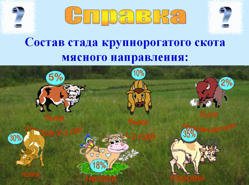 Прочитайте информационную справку: состав стада крупнорогатого скота мясного направления: коровы – 35%, нетели – 18%, телки до года – 30%, быки от года до двух – 10%, быки старше двух лет – 5%, быки производители – 2%. В стаде мясного направления 140 голов крупнорогатого скота. Используя, данную информацию выполните задания: