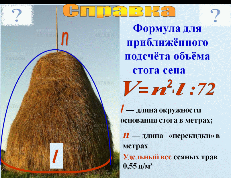Учитель: Для учёта урожая сена по объёму и весу устанавливают объём стога, после чего по данным обмера определяют вес сена по специальной методике. Чтобы найти вес сена, надо объём стога умножить на удельный вес травы.
