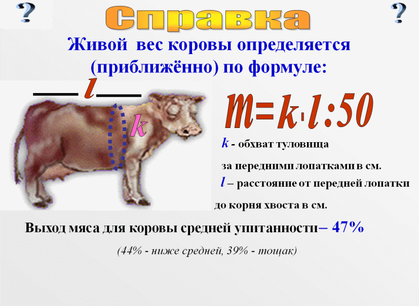 , где k - обхват туловища за передними лопатками в см,l– расстояние от передней лопатки до корня хвоста в см. Выхода мяса для коровы средней упитанности – 47% (44% - ниже средней, 39% - тощак).