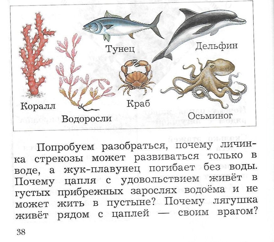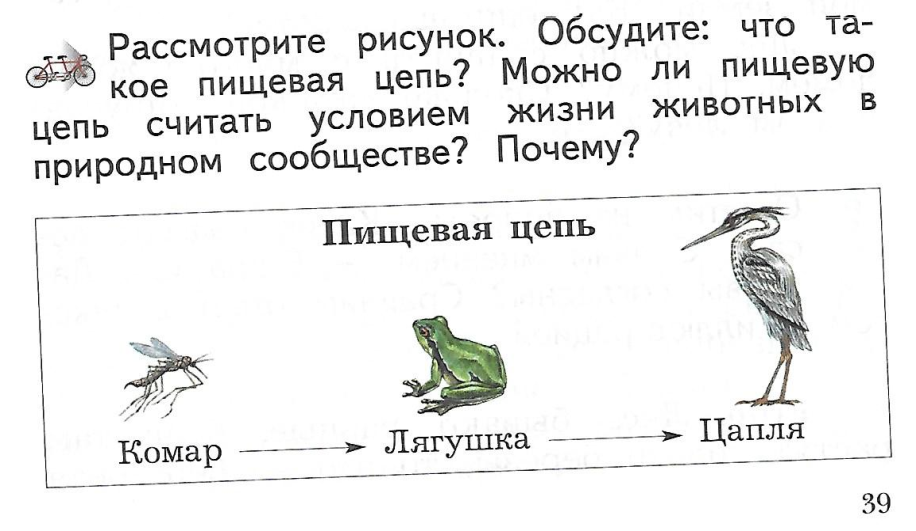 - Прочитайте текст на стр.38-39 и ответьте на вопрос «Почему цапля живет рядом с лягушкой?» (они связаны по цепи питания)