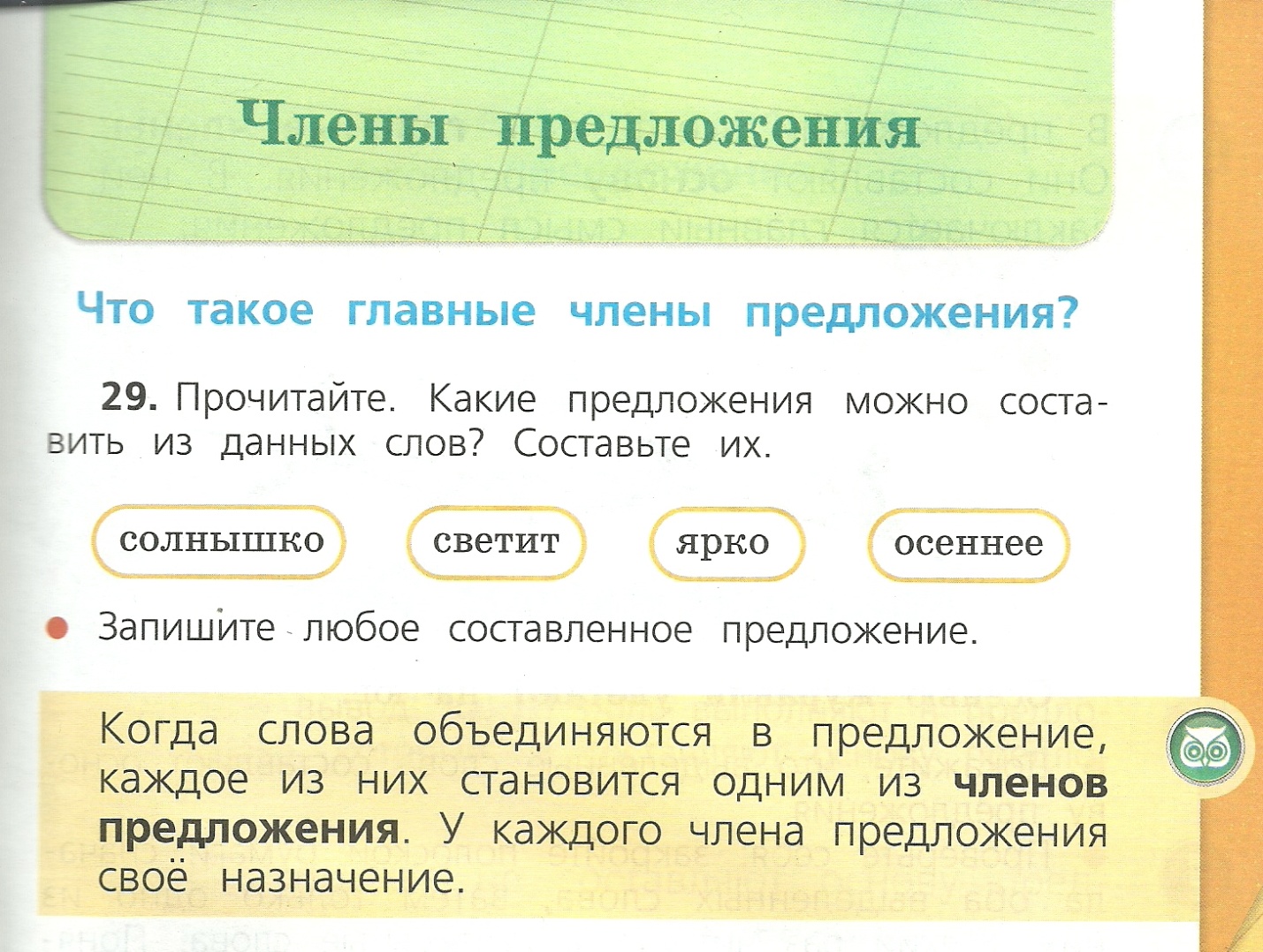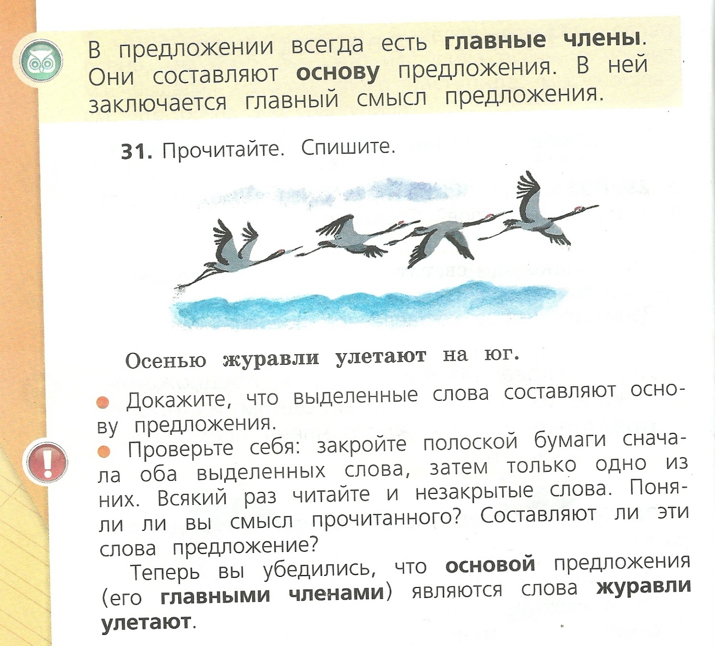 Отвечают: Я учусь находить главные и второстепенные члены предложения и находить основу предложения. Анализируют. Оценивают. | Это цель, к которой шли. Регулятивные: оценивание результатов. |