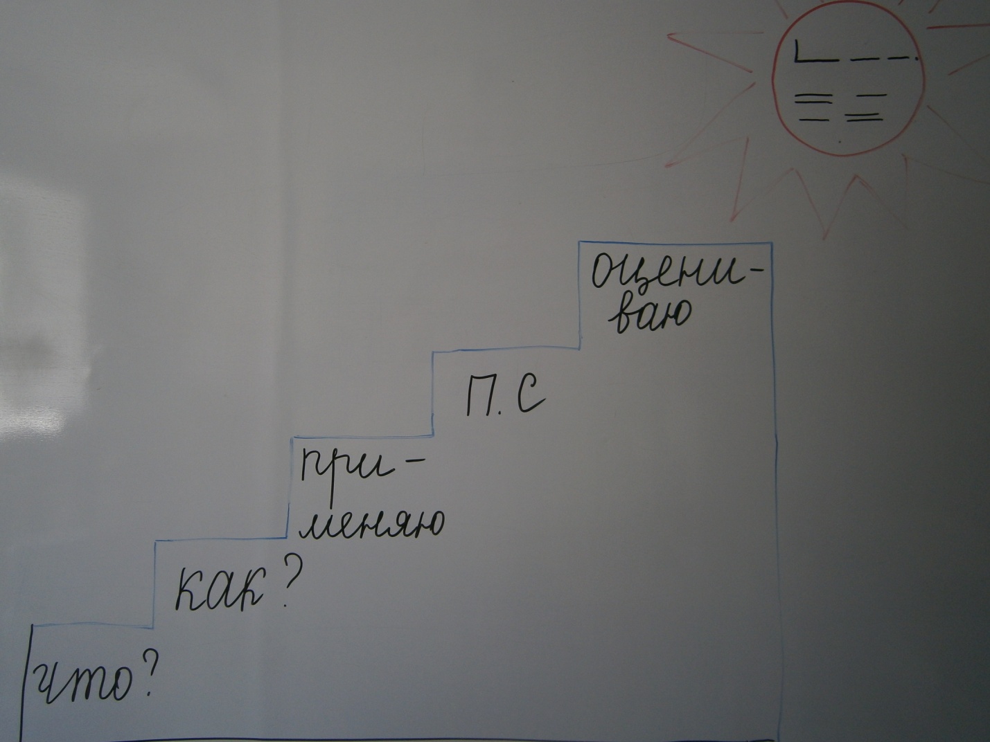 4.Планиро-вание предстоя-щей деятельнос-ти. Цель: составление плана действий | Какая ступенька в нашем плане будет следующая? Что поможет в достижении цели? | Отвечают вторая (КАК?) Называют и фиксируют знаками на доске: 1.учебник 2.вопрос 3.правило 4. задания | Отвечают вторая (КАК?) Называют и фиксируют знаками на доске: 1.учебник 2.наши знания 3. задания 4. применение умений | Регулятивные: планирование учебной деятельности Познавательные: знаково – символическое обозначение |