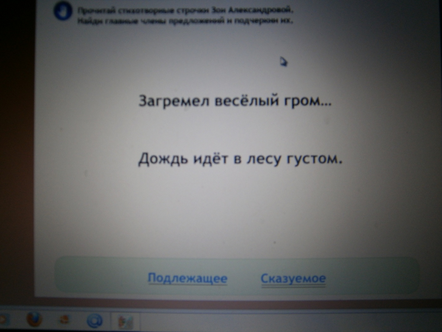 6. Контроль за процесс-сом и ре-зультатом учебной деятель-ности. Цель: обучение способам контроля и самооцен-ки деятель-ности. | Спрашиваю, какой шаг следующий? Предлагаю 2 классу «Проверь себя» выполнить на компьютере CD приложение к учебнику. Предлагаю 4 классу по упр.23 выполнить задания. Предлагаю оценить свою деятельность с помощью знака светофора. Зелёный – всё понятно, жёлтый – сомневаюсь, красный – сигнал опасности, не всё получилось. | Отвечают что 4 ступенька (П.С) Проверь себя Работают с компьютером, задание: Прочитай стихотворные строчки Зои Александровой. Загремел весёлый гром… Дождь идёт в лесу густом. Подчеркните подлежащее и сказуемое. Работают самостоятельно Берут светофоры и показывают определённый знак. | Отвечают что 4 ступенька (П.С) Проверь себя Устно находят в предложениях главные члены, доказывают, почему они называются главными, называют какую роль в данных предложениях играют второстепенные члены. Берут светофоры и показывают определённый знак. | Регулятивные: Планирование Регулятивные: самооценка |