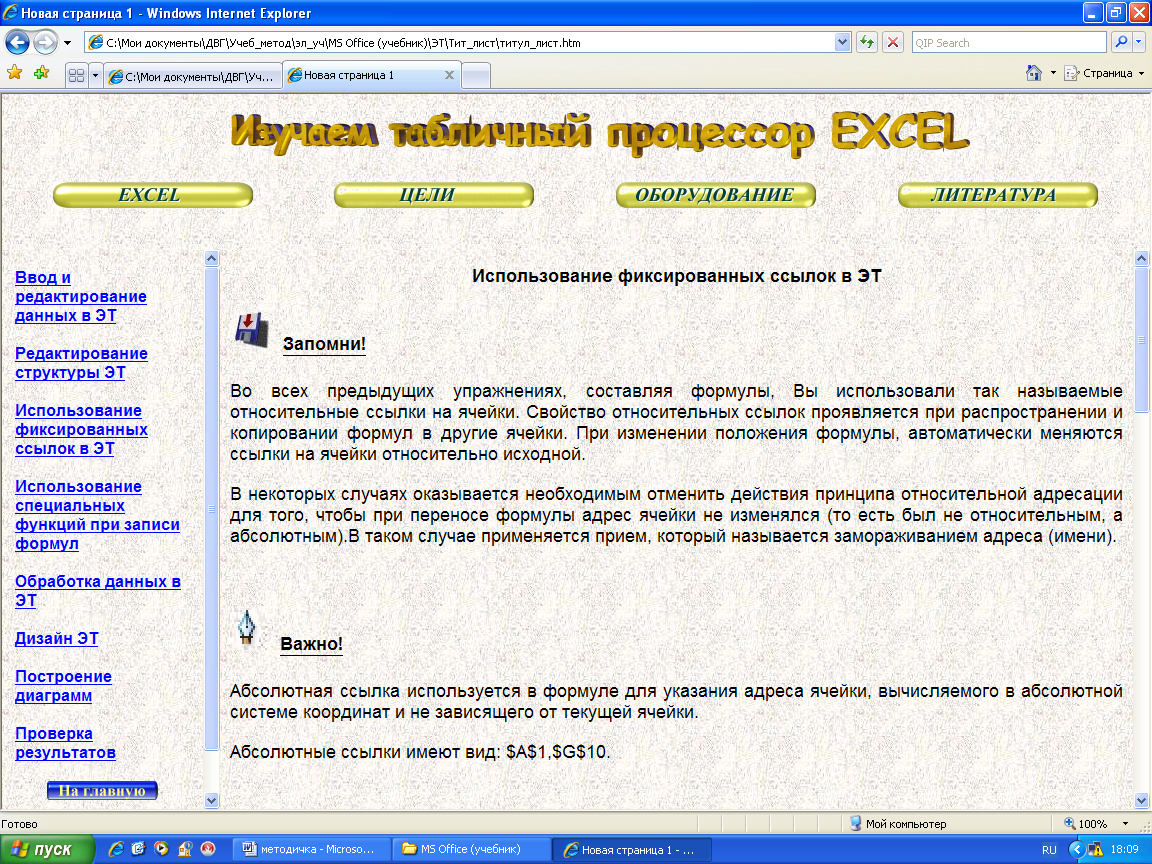 Содержание деятельности студентов | Работа в индивидуальном режиме с электронными учебниками, загруженными на каждый ПК. Иллюстративный материал: листы с записями: H2 – относительная ссылка $H$2 - абсолютная ссылка $H2, H$2 - смешанная ссылка | ||